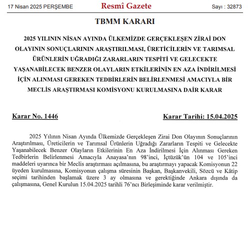Türkiye Büyük Millet Meclisi, Nisan 2025’te başta Elazığ olmak üzere birçok ilde etkili olan zirai donun tarım sektöründe yarattığı tahribatı incelemek amacıyla bir Meclis Araştırma Komisyonu kurulmasına karar verdi. Bu karara ilişkin duyuru, 17 Nisan 2025 tarihli Resmî Gazete’de yayımlandı.