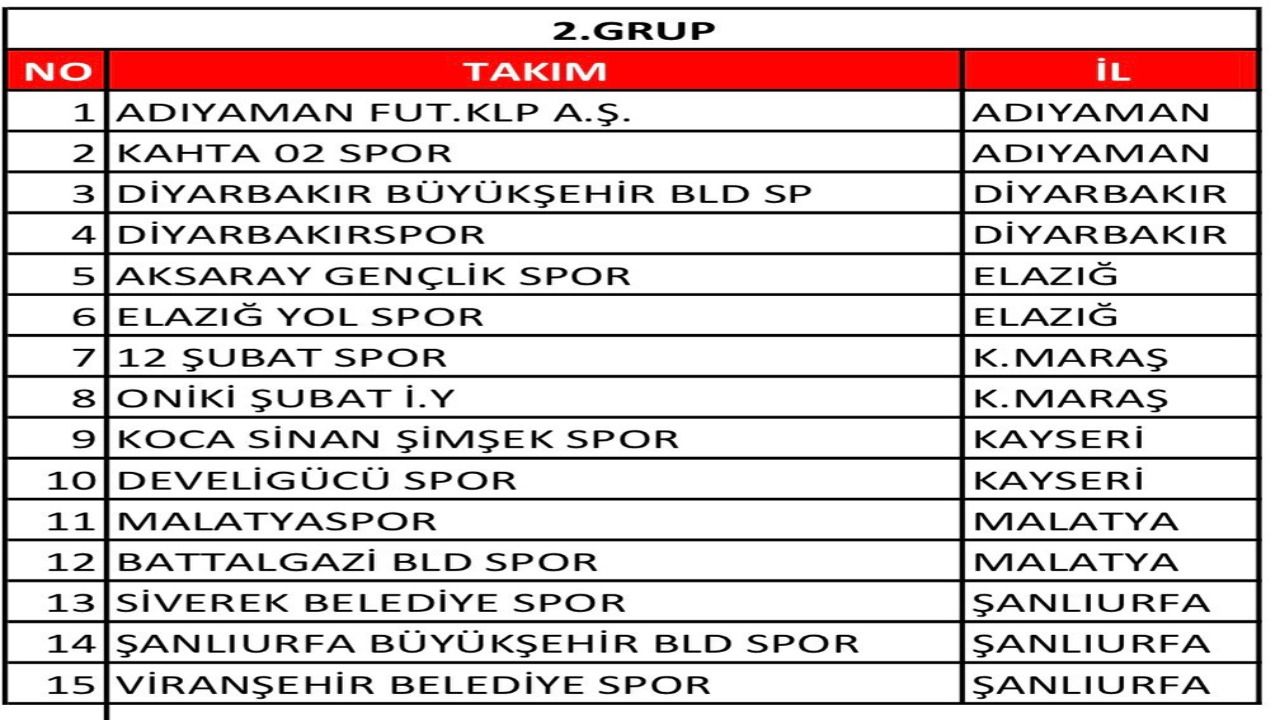 İkinci grupta Adıyaman, Diyarbakır, Malatya, Elazığ ve Kahramanmaraş’tan ikişer takım ile Şanlıurfa’dan üç takım olmak üzere toplam 15 takım mücadele edecek.