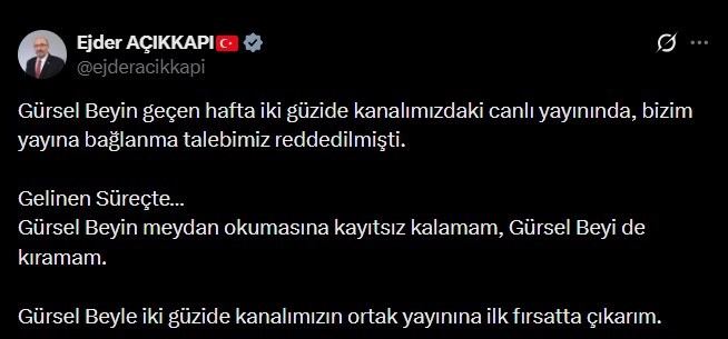 Ejder Açıkkapı, yerel basında yer alan açıklamasında, davete kayıtsız kalmayacağını belirterek Elazığ’daki iki yerel televizyon kanalının ortak yayınında ilk uygun zamanda bir araya gelmeye hazır olduğunu duyurdu. Söz konusu programın, Elazığ’ın öncelikli meseleleri ve devam eden yatırımlar başta olmak üzere çeşitli başlıkları içermesi bekleniyor.