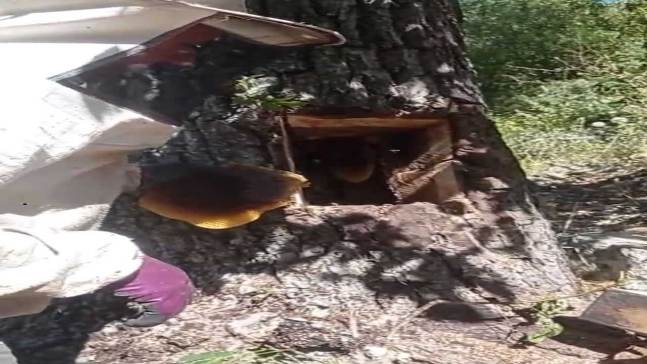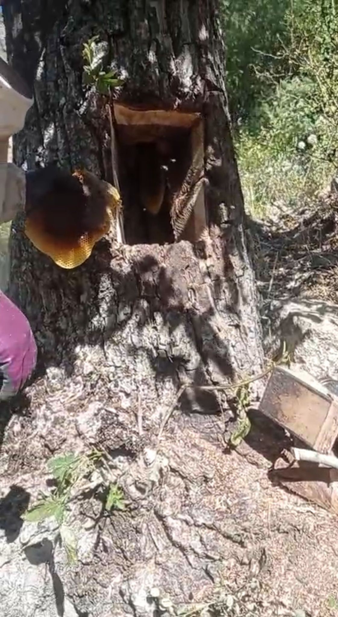 Elazığ’ın Palu ilçesinde arıların izini süren 2 kişi ağaç kovuğundan petek petek halinde yaklaşık 5 kilo bal çıkardı.