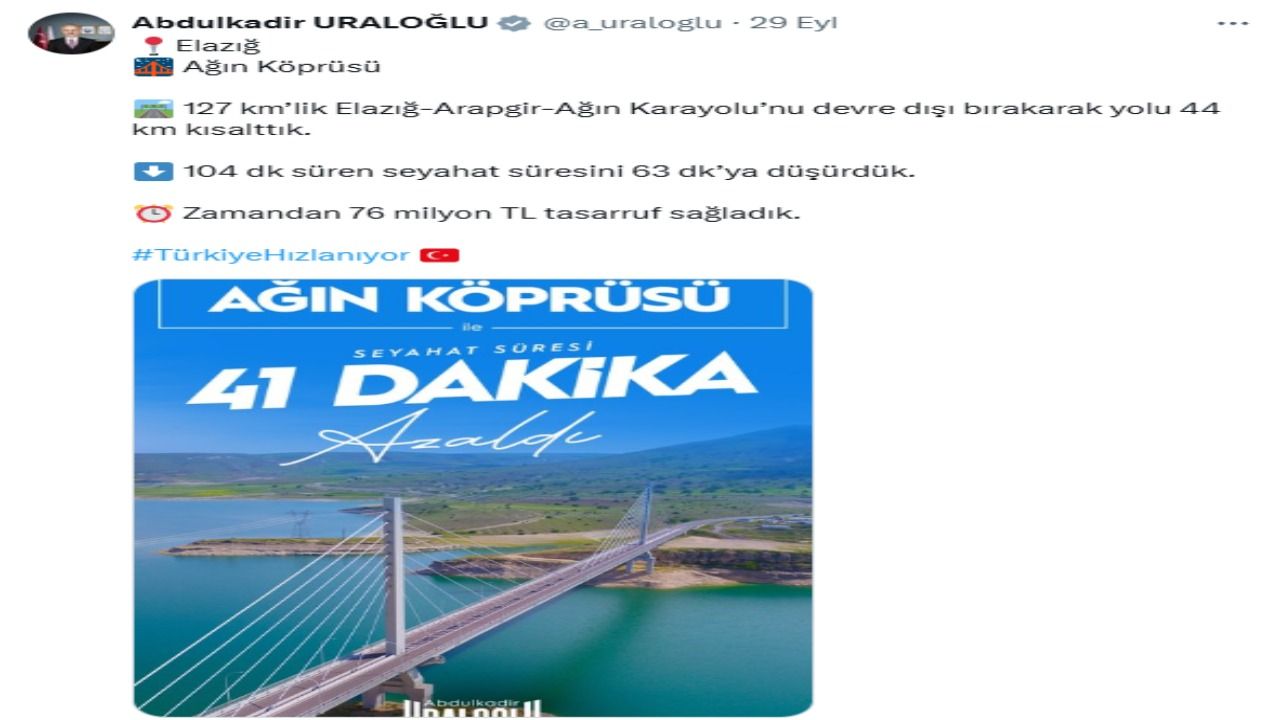 Elazığ’ın ulaşım altyapısına önemli bir katkı sağlayan Ağın Köprüsü, hizmete girdi. Ulaştırma ve Altyapı Bakanı Abdulkadir Uraloğlu’nun açıklamasına göre, köprü devreye alınmadan önce 127 kilometre olan Elazığ-Arapgir-Ağın Karayolu, yeni güzergâhla birlikte 83 kilometreye düşürüldü. Bu sayede yolculuk süresi 104 dakikadan 63 dakikaya indi.