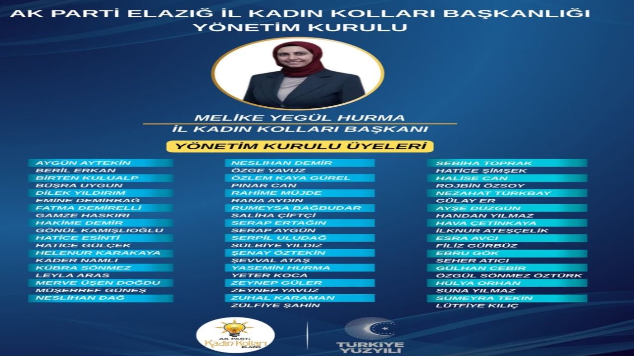 AK Parti Elazığ İl Kadın Kolları teşkilatında yeni dönem yapılanması tamamlandı. İl Kadın Kolları Başkanlığı görevine atanan Melike Yegül Hurma’nın koordinasyonunda yürütülen değerlendirme süreci sonucunda İl Yönetim Kurulu listesi netleşti. Teşkilat çalışmaları, saha faaliyetleri ve sosyal projeler doğrultusunda belirlenen yeni yönetim kadrosunun, önümüzdeki süreçte parti çalışmalarına aktif şekilde katkı sunması hedefleniyor.