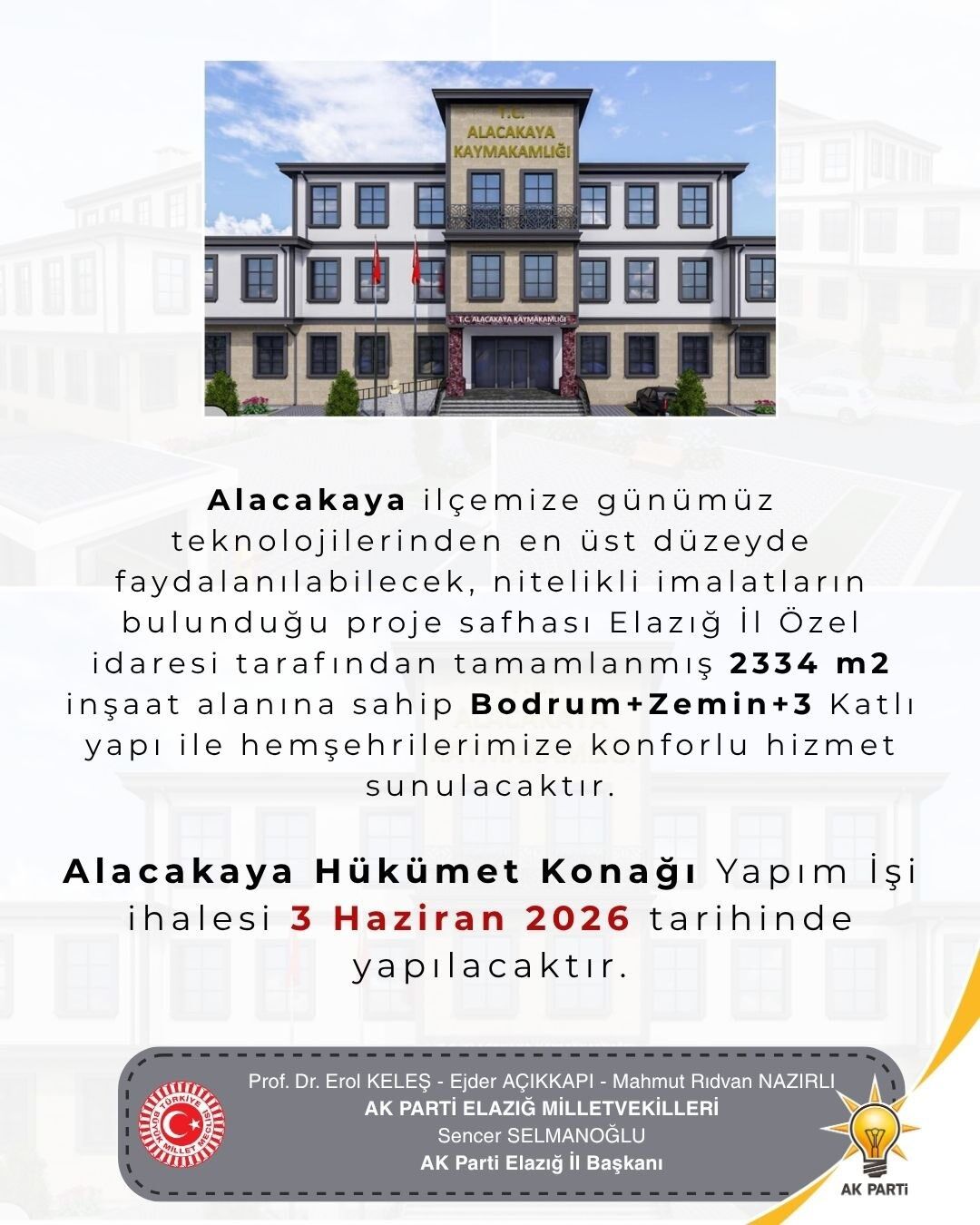 Alacakaya ilçesinde kamu hizmetlerinin daha etkin ve modern koşullarda sunulması amacıyla planlanan yeni Hükümet Konağı projesinde önemli bir aşamaya gelindi. Elazığ İl Özel İdaresi tarafından proje çalışmaları tamamlanan yatırımın ihale tarihi 3 Haziran 2026 olarak açıklandı.