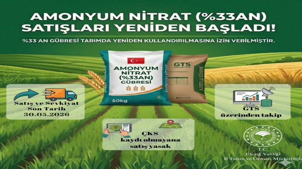 Öte yandan Amonyum Nitrat (%33 AN) gübresinin satış ve sevkiyat işlemleri 30 Mayıs 2026 tarihine kadar devam edecek. Dağıtıcıların, gerçekleştirdikleri satışları eş zamanlı olarak sistem üzerinden stok düşümü şeklinde kaydetmeleri zorunlu olacak.