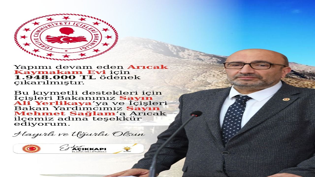 AK Parti Elazığ Milletvekili Ejder Açıkkapı, Arıcak ilçesi için sağlanan bu mali desteğin, yerel idari altyapının güçlendirilmesi açısından önemli bir adım olduğunu belirtti. Sürecin olumlu şekilde ilerlemesine katkı sunan İçişleri Bakanlığı yetkililerine teşekkür edildi.