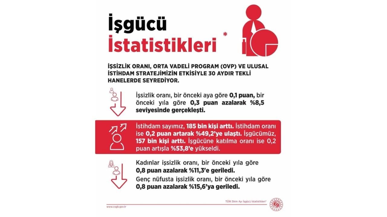 "Orta Vadeli Program ile uyumlu olarak hazırladığımız Ulusal İstihdam Stratejimizin de etkisiyle işsizlik oranı, 30 aydır tekli hanelerde seyrediyor. İşsiz sayısı, Ekim ayında bir önceki aya göre 27 bin kişi azalarak 3 milyon 33 bin kişiye geriledi. Böylelikle işsizlik oranı da bir önceki aya göre 0,1 puan, bir önceki yıla göre 0,3 puan azalarak yüzde 8,5 seviyesinde gerçekleşti. İstihdam sayımız, aynı dönemde 185 bin kişi artarak 32 milyon 772 bin kişiye, istihdam oranı ise 0,2 puan artarak yüzde 49,2’ye ulaştı. İşgücümüz, 157 bin kişi artışla 35 milyon 804 bin kişiye, işgücüne katılma oranı ise 0,2 puan artışla yüzde 53,8’e yükseldi. Kadınlarda işsizlik oranı, bir önceki yıla göre 0,8 puan azalarak yüzde 11,3 olarak gerçekleşti. Başta İş Pozitif olmak üzere istihdamı destekleyici programlar sayesinde kadınlarda istihdam oranı bir önceki aya göre 0,6 puan artarak yüzde 32,4, işgücüne katılma oranı ise 0,7 puan artarak yüzde 36,5 olarak gerçekleşti. Gençlerimizin kariyer adımlarını her zaman destekliyoruz. Gençlerde işsizlik oranı, bir önceki yıla göre 0,8 puan azalarak yüzde 15,6’ya geriledi. Ülkemiz için hayalleri olan gençlerimizin yanında olmaya devam edeceğiz. Özellikle son dönemde yeşil ve dijital dönüşümün çalışma hayatı üzerindeki etkisinin farkındayız. Ülkemizin şartlarına uygun, insanı ve emeği merkeze alan politikalarımızı sürdüreceğiz. Daha güçlü bir istihdam yapısı ve çalışma hayatı için gayretle çalışacağız."