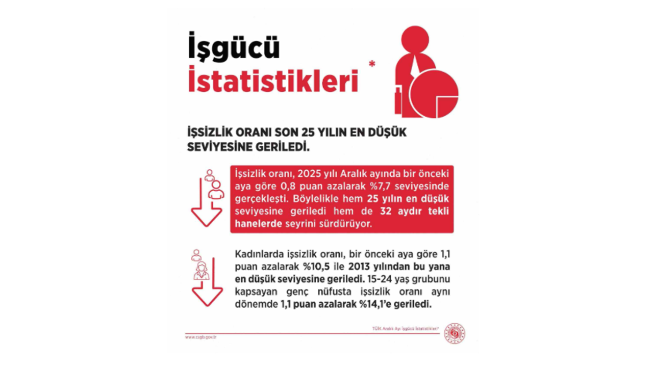 Çalışma ve Sosyal Güvenlik Bakanı Vedat Işıkhan, sosyal medya hesabından aralık ayı işsizlik ve istihdam verilerine ilişkin açıklamalarda bulundu. İşsizlik oranının son 25 yılın en düşük seviyesine gerilediğini belirten Işıkhan, "İşsizlik oranı, 2025 yılı Aralık ayında bir önceki aya göre 0,8 puan azalarak yüzde 7,7 seviyesinde gerçekleşti. Böylelikle hem 25 yılın en düşük seviyesine geriledi hem de 32 aydır tekli hanelerde seyrini sürdürüyor. İşsiz sayısı ise 286 bin kişi azalarak, 2 milyon 736 bin kişiye geriledi" diye konuştu.