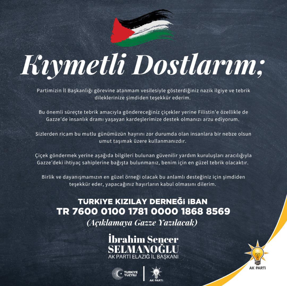 Selmanoğlu, açıklamasında şu ifadeleri kullandı: “İl Başkanlığı görevime atanmam vesilesiyle gösterdiğiniz ilgi ve nazik tebrikleriniz için teşekkür ederim. Bu mutlu anımızın sevinci yerine, zor durumda olan kardeşlerimize destek olmanız bizler için çok değerli olacaktır. Çiçek göndermek yerine, Gazze’deki insanlara yardım etmenizi rica ediyorum.”