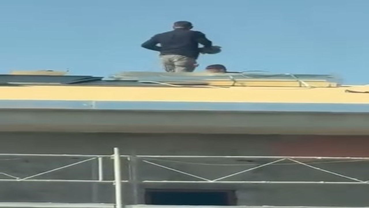 Elazığ’da 5 katlı binanın çatısında hiçbir güvenlik almadan çalışan işçiler yürekleri ağza getirdi.