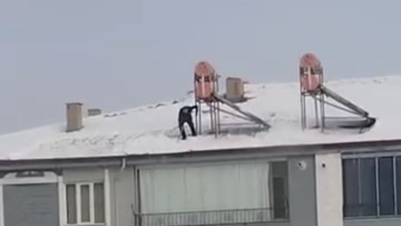 Elazığ'da geçen hafta etkili olan kar yağışı, donla birlikte çatıların üzerinde kaldı. Bir vatandaş, 4 katlı binanın çatısına çıkarak karları kürekle temizlemeye başladı. Sadece çatı üzerindeki güneş enerjisinin demir ayağına tutunarak karları temizlemeye çalışan şahıs, cep telefonu kamerasıyla görüntülendi. Ayağının kayması veya dengesini kaybetme riskiyle karşı karşıya kalan şahsın yaptığı tehlikeli temizlik, izleyenlerin yüreklerini ağza getirdi.