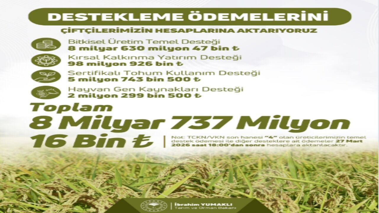 Bitkisel üretimden kırsal kalkınma yatırımlarına, sertifikalı tohum kullanımından hayvan gen kaynaklarının korunmasına kadar geniş bir alanı kapsayan destek paketi, üretimin sürdürülebilirliğine katkı sunmayı hedefliyor. Özellikle bahar sezonu öncesinde yapılan bu ödemelerin, tarımsal faaliyetlere ivme kazandırması bekleniyor.