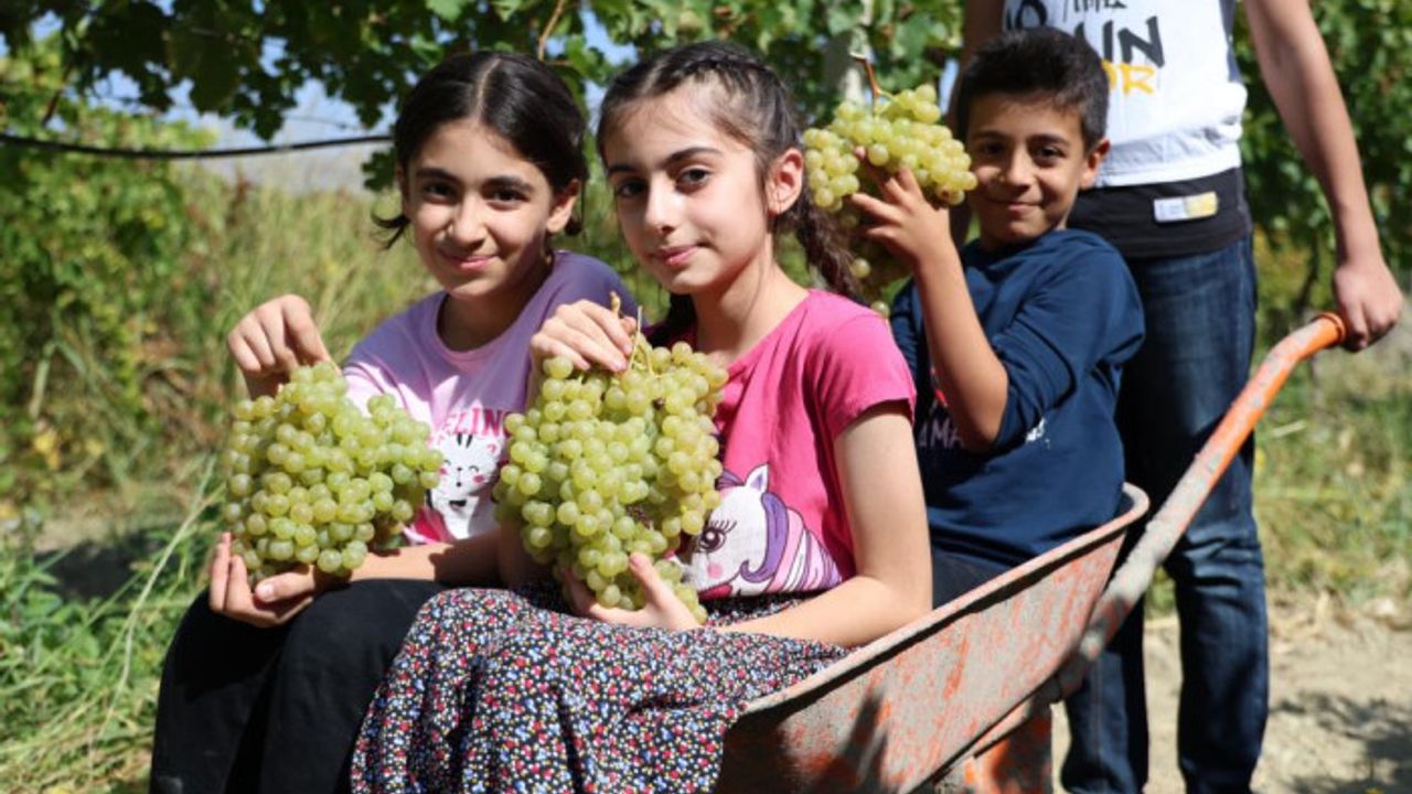 Elazığ’ın bağlarında süren üzüm hasadına çocuklar renk katıyor. Üzüm salkımlarının arasında bir yandan ailelerine yardım eden çocuklar bir yandan da tarım ile iç içe oluyor.