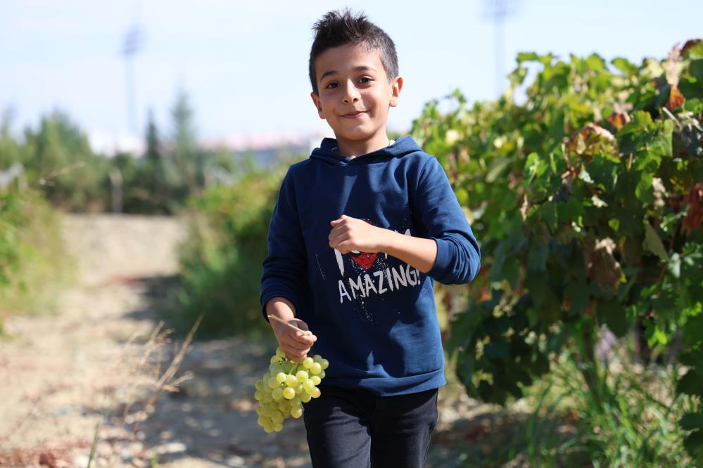 Anne ve babalarıyla birlikte bağlara giden çocuklar, hem üzüm topluyor hem de doğal bir oyun alanında keyifli vakitler geçiriyor. Üzüm salkımlarıyla poz veren çocuklar, neşeli gülümsemeleriyle fotoğraf karelerine de renk katıyor. Minikler, hem tarımı öğreniyor hem de bu muhteşem anıları hem arkadaşları hem de aileleriyle paylaşıyor.