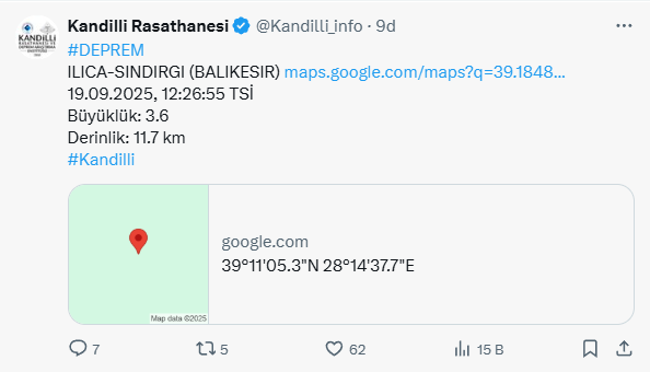 AFAD verilerine göre, deprem 3.5 büyüklüğünde kaydedildi ve yerin yaklaşık 9,4 kilometre derinliğinde gerçekleşti.