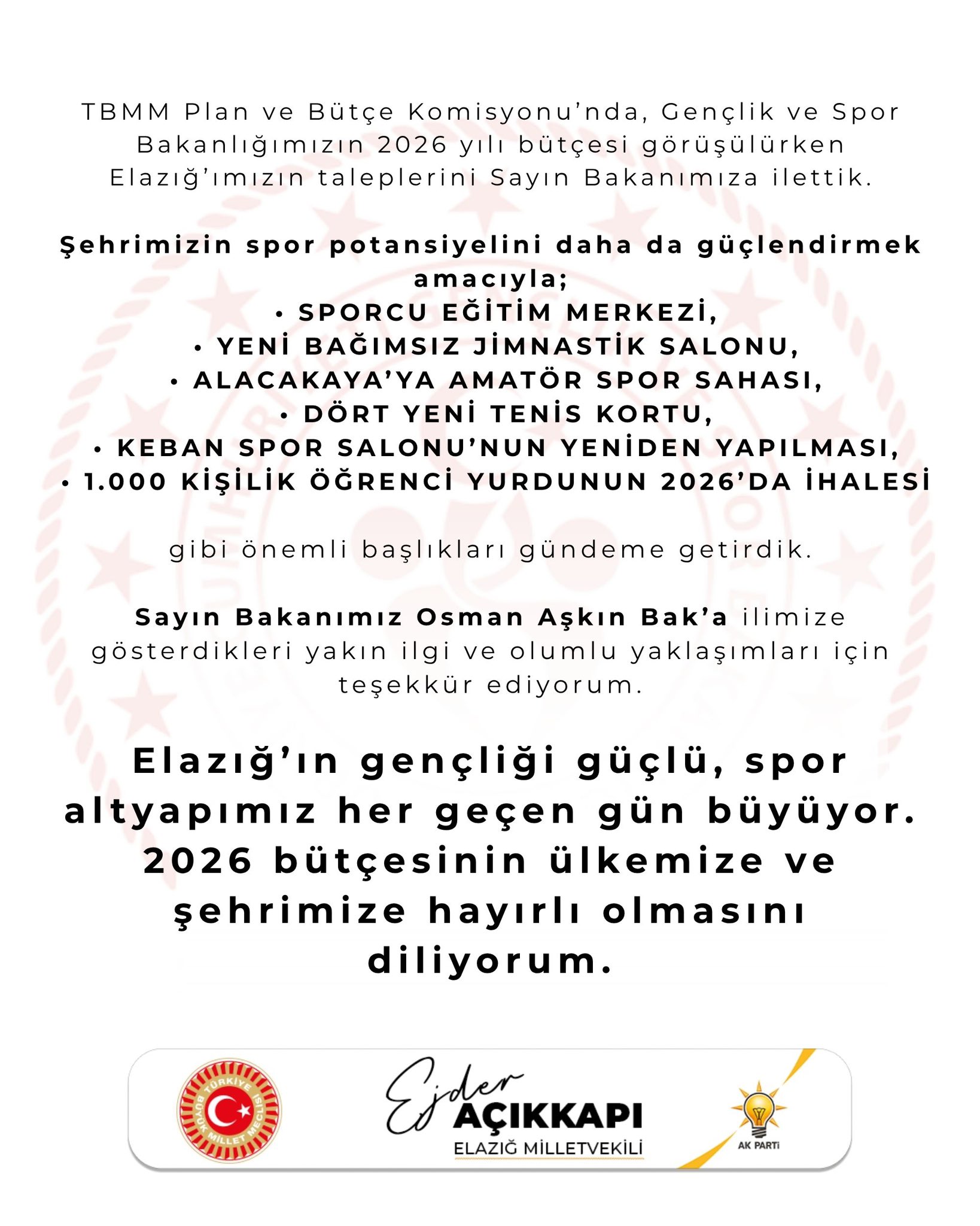 Açıkkapı, Gençlik ve Spor Bakanı Osman Aşkın Bak’a iletilen talepler arasında Sporcu Eğitim Merkezi’nin kurulması, bağımsız bir jimnastik salonu yapılması, Alacakaya’ya amatör spor sahası kazandırılması, dört yeni tenis kortunun projelendirilmesi, Keban Spor Salonu’nun yeniden inşası ve 1.000 kişilik öğrenci yurdu ihalesinin 2026 yılı içerisinde tamamlanması gibi başlıkların yer aldığını kaydetti.