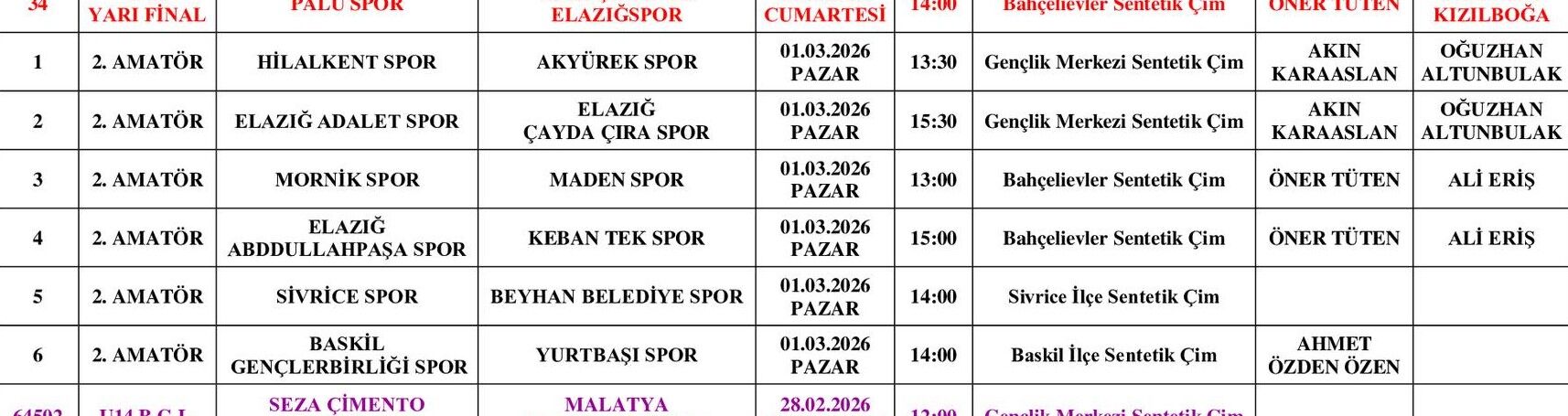 Haftanın açılış programında Hilalkent Spor ile Akyürek Spor karşı karşıya gelecek. Elazığ Adalet Spor ile Elazığ Çayda Çıra Spor mücadelesi de haftanın dikkat çeken karşılaşmaları arasında yer alıyor. Mornik Spor’un Maden Spor’la oynayacağı mücadele, Elazığ Abdullahpaşa Spor ile Keban Tek Spor karşılaşması, Sivrice Spor ile Beyhan Belediye Spor müsabakası ve Baskil Gençlerbirliği Spor ile Yurtbaşı Spor karşılaşması da ilk haftanın diğer maçları olarak programda bulunuyor.