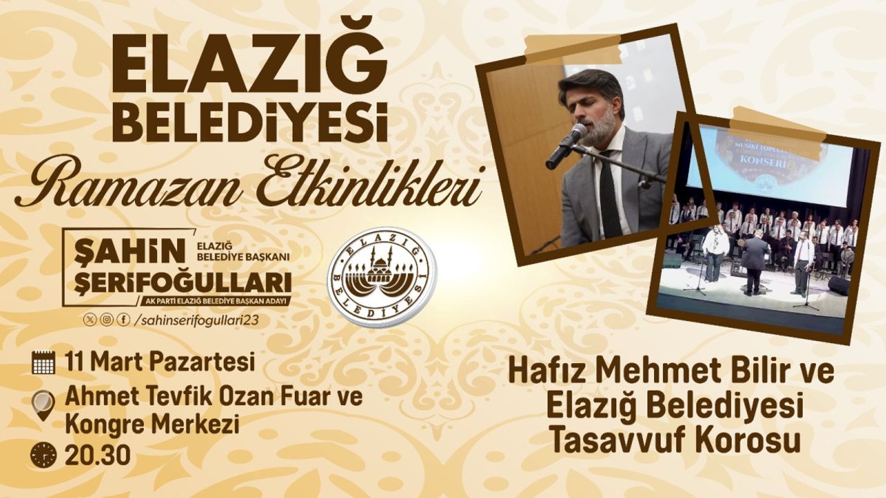 Elazığ Belediyesi Ramazan etkinlikleri kapsamında; Abdurrahman Önül, Eşref Ziya Terzi, Mustafa Cihat, Grup Tillo, Sedat Uçan, Adile Kurt Karatepe, Ömer Ahmet Turhan, Ömer Karaoğlu, Yücel Arzen ve Esat Kabaklı dinleti programlarıyla Elazığlılarla buluşacak.