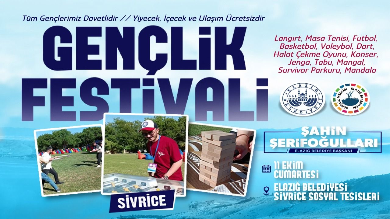 Bu kapsamda Elazığ Belediyesi Gençlik Meclisi tarafından, Gençlik Festivali düzenlenecek. 11 Ekim Cumartesi günü Sivrice Elazığ Belediyesi Sosyal Tesisleri’nde Elazığlı gençlerin doğayla iç içe, eğlence dolu bir gün yaşayacağı etkinlikte; langırt, masa tenisi, futbol, basketbol, voleybol, dart, halat çekme oyunu, survivor parkuru, mandala atölyesi, tabu ve jenga gibi birçok aktivite yer alacak. Tamamen ücretsiz olacak organizasyonda ayrıca gün boyunca konserler ve mangal etkinliği de gerçekleştirilecek.