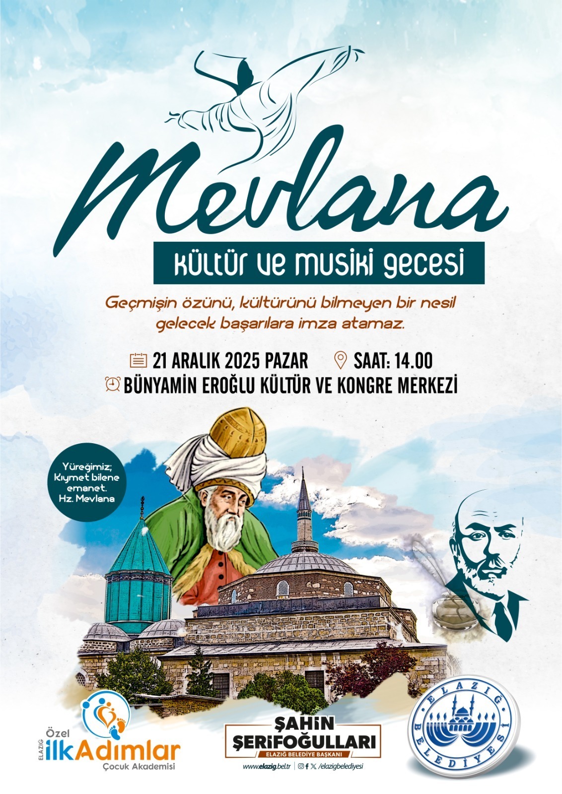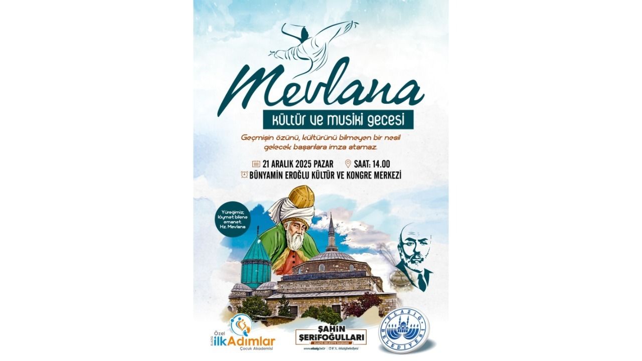 Elazığ Belediyesi ile Özel İlk Adımlar Çocuk Akademisi tarafından ortaklaşa olarak Mevlana Haftası dolayısıyla, “Geçmişin özünü, kültürünü bilmeyen bir nesil; gelecek başarılara imza atamaz.” teması ile Mevlana Kültür ve Musiki Gecesi programı düzenleyecek.