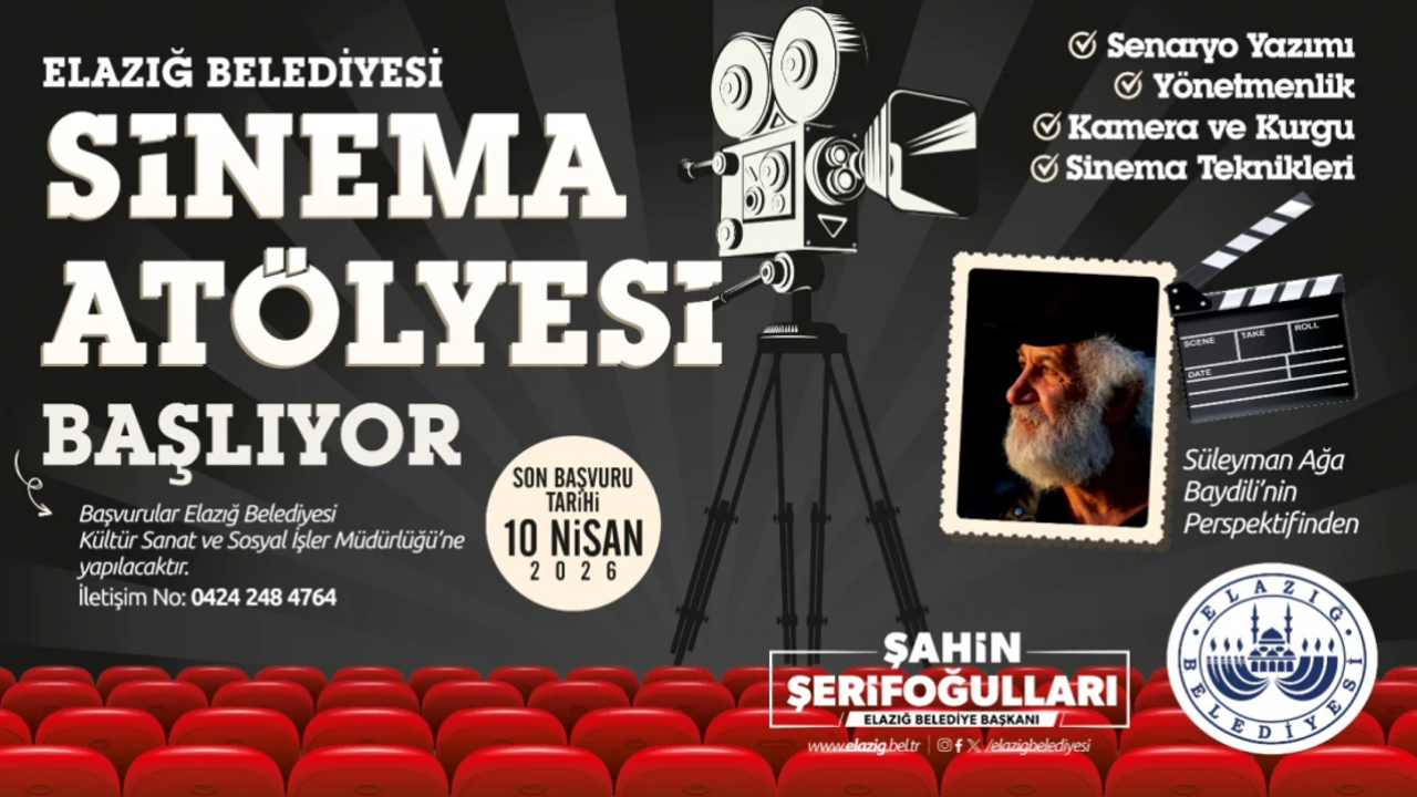 Elazığ Belediyesi Basın-Yayın ve Halkla İlişkiler Müdürlüğü’nden yapılan açıklamada, “Usta yönetmen Süleyman Ağa Baydili rehberliğinde yürütülecek Sinema Atölyesi eğitim programına katılmak isteyenler Elazığ Belediyesi Kültür, Sanat ve Sosyal İşler Müdürlüğü’ne şahsen başvuruda bulunabilecek, 0-424 248 47 64 nolu telefon hattı üzerinden bilgi alabilecekler. Bünyamin Eroğlu Kültür ve Kongre Merkezi Sinema Akademisi Salonu’nda, hafta içi 17.00-18.00 saatleri arasında düzenlenecek eğitim programı, 10 Nisan Cuma günü başlayacak. Sinemaya ilgi duyan gençlerimizin bu özel programda yerlerini almalarını bekliyoruz.” denildi.