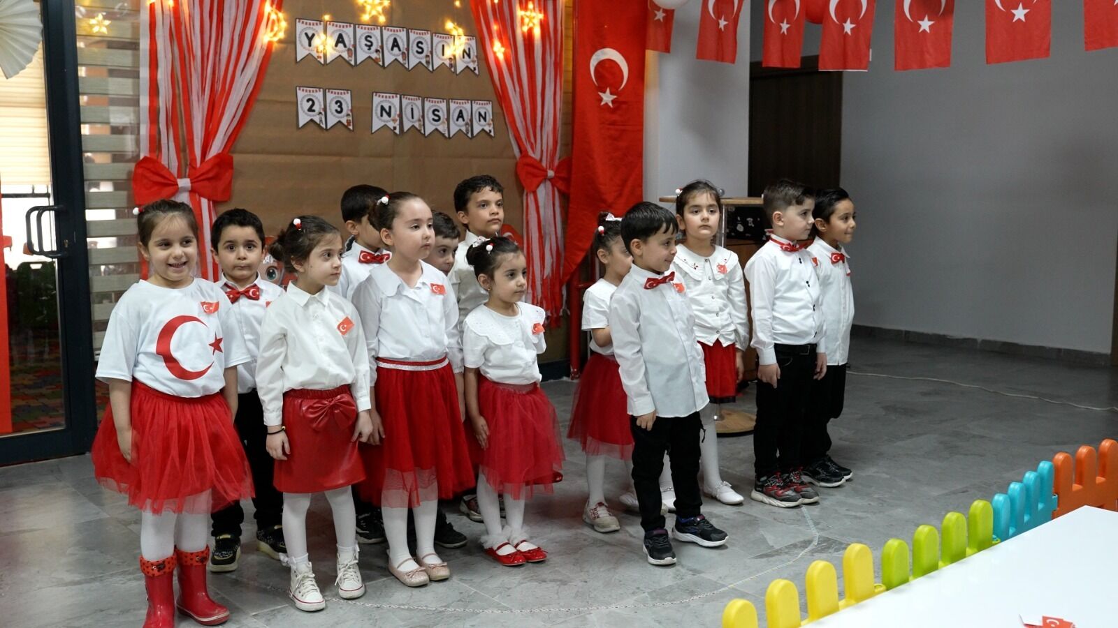 Çok sayıda davetlinin katıldığı programda Kur’an-ı Kerim tilaveti ve şiir dinletisinin yer alırken, etkinlikte minikler geleneksel halk oyunları gösterisi ile beğeni topladı. Bayrak gösterisi salonda coşku dolu anlara sahne olurken, katılımcılardan alkış aldı. Programda miniklerin mutluluğu ve heyecanı görülmeye değerdi.
