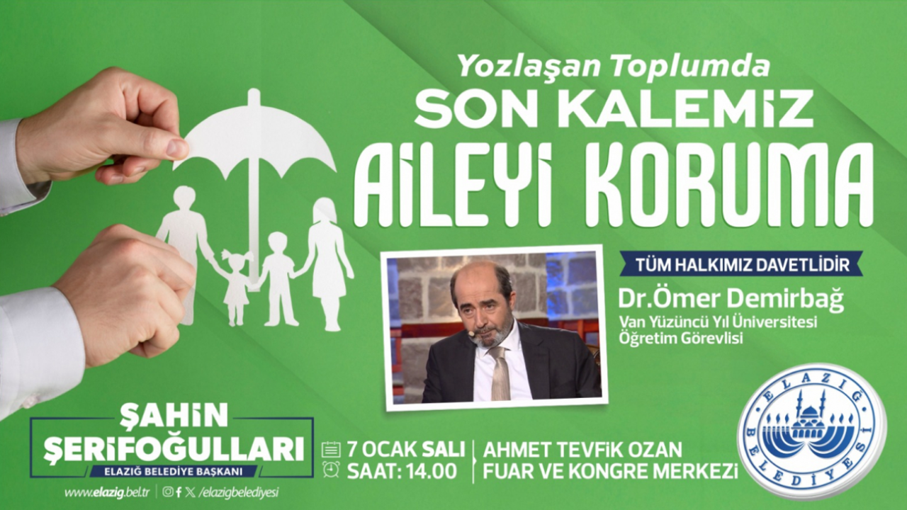 Elazığ Belediyesi, toplumsal değerlerin korunması ve ailenin önemine dikkat çekmek amacıyla anlamlı bir konferans düzenleyecek. Van Yüzüncü Yıl Üniversitesi Öğretim Üyesi Dr. Ömer Demirbağ’ın konuşmacı olarak katılacağı, “Yozlaşan Toplumda Son Kalemiz Aileyi Korumak” başlıklı konferans, 7 Ocak Salı günü saat 14.00’te Ahmet Tevfik Ozan Fuar ve Kongre Merkezi’nde gerçekleşecek.