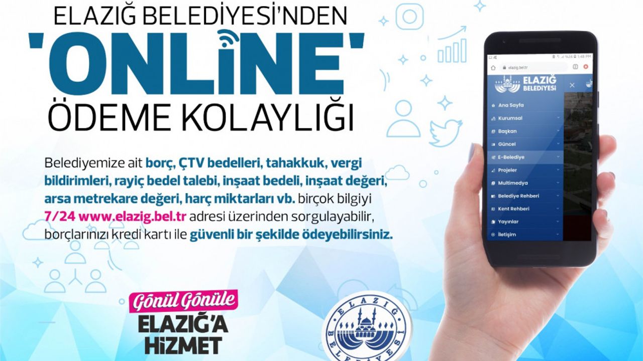 Vatandaşlar, www.elazig.bel.tr adresi üzerinden, belediyeye ait vergi bildirimleri, borç, tahakkuk, rayiç bedel talebi, inşaat bedeli, inşaat değeri, arsa metrekare değeri, ÇTV bedelleri, harç miktarları vb. birçok bilgiyi 7/24 sorgulayarak borçlarını kredi kartı ile güvenli bir şekilde ödeyebiliyorlar.