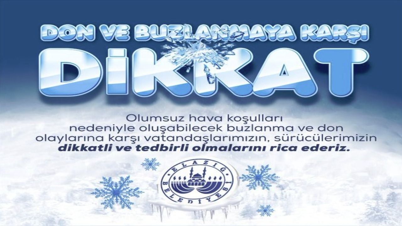 Elazığ Belediyesi, kent genelinde hava sıcaklıklarının mevsim normallerinin altına düşmesiyle birlikte don ve buzlanma riskine karşı uyarıda bulundu. Yapılan bilgilendirmede, gece ve sabah saatlerinde yollarda oluşabilecek buzlanmanın trafik güvenliğini olumsuz etkileyebileceğine dikkat çekildi.