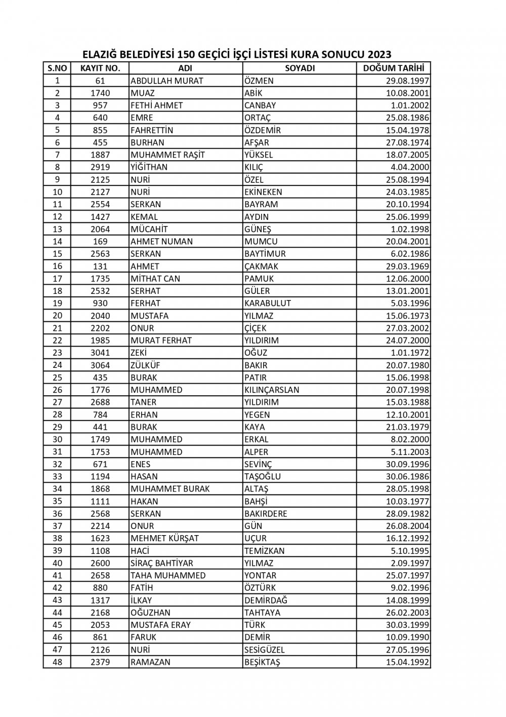 Elazığ Belediyesi tarafından alınacak 150 geçici işçinin isim listesi Belediye tarafından paylaşıldı.