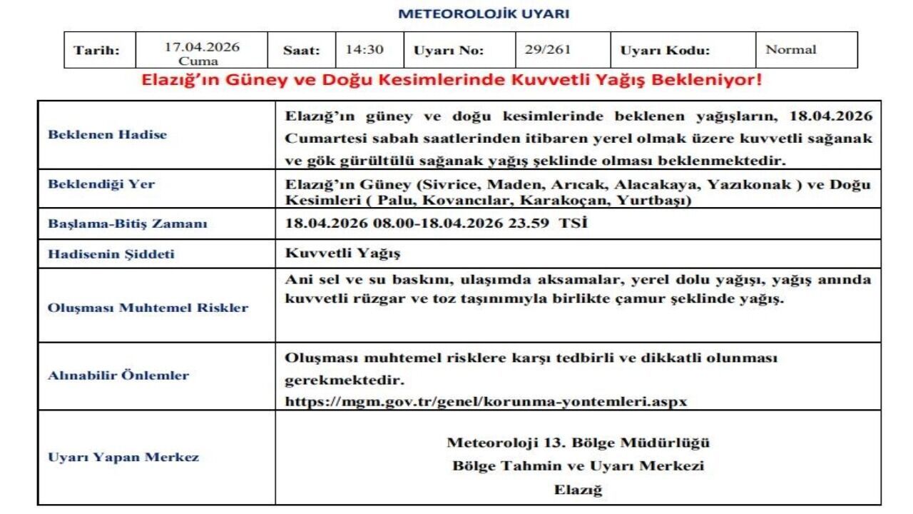 Meteoroloji 13. Bölge Müdürlüğü'nden yapılan açıklamada, 'Elazığ'ın güney ve doğu kesimlerinde beklenen yağışların, 18.04.2026 Cumartesi sabah saatlerinden itibaren yerel olmak üzere kuvvetli sağanak ve gök gürültülü sağanak yağış şeklinde olması beklenmektedir. Beklendiği yer Elazığ'ın güney (Sivrice, Maden, Arıcak, Alacakaya, Yazıkonak ) ve doğu kesimleridir ( Palu, Kovancılar, Karakoçan, Yurtbaşı). Oluşması muhtemel riskler; ani sel ve su baskını, ulaşımda aksamalar, yerel dolu yağışı, yağış anında kuvvetli rüzgar ve toz taşınımıyla birlikte çamur şeklinde yağıştır. Oluşması muhtemel risklere karşı tedbirli ve dikkatli olunması gerekmektedir' denildi.
