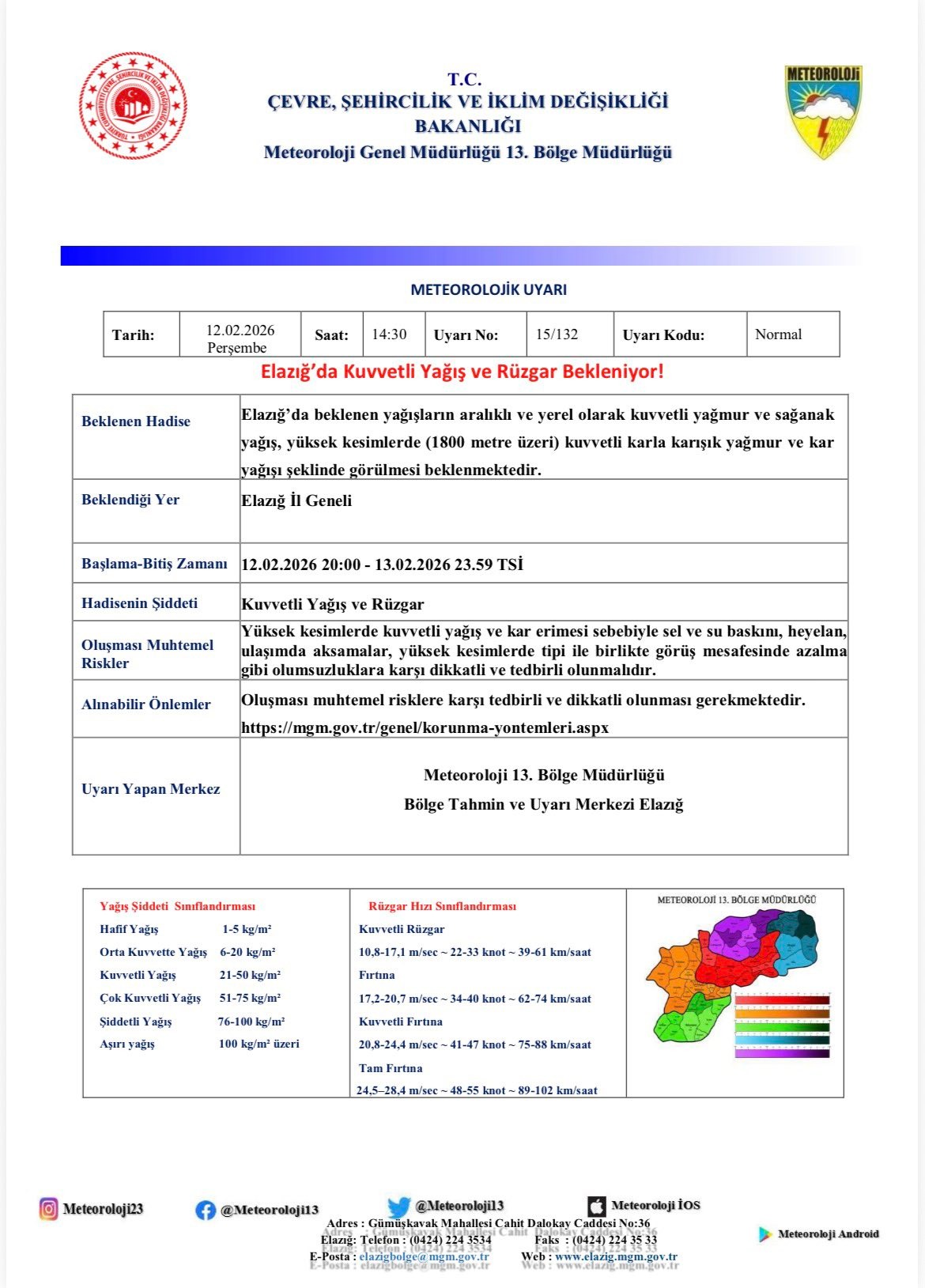 Meteoroloji 13. Bölge Müdürlüğü, 13 Şubat Cuma günü Elazığ genelinde etkili olması beklenen kuvvetli sağanak ve saatte 60 kilometreye ulaşabilecek rüzgârlara karşı uyarıda bulundu.