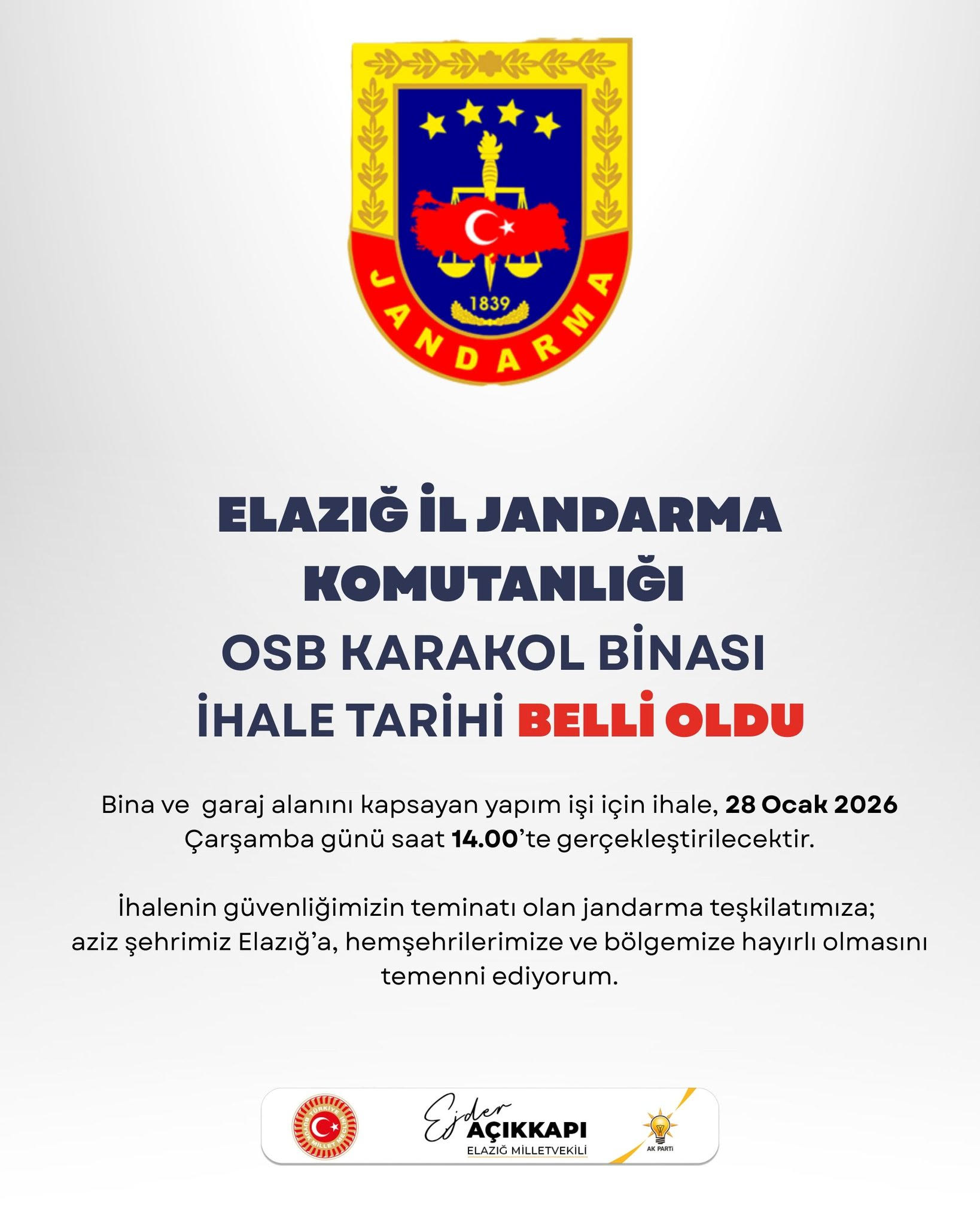 Elazığ’ın güvenlik altyapısını güçlendirecek önemli bir yatırım daha hayata geçiriliyor. Elazığ İl Jandarma Komutanlığı bünyesinde Organize Sanayi Bölgesi’nde inşa edilecek Karakol Binası Yapım İşi, 4734 sayılı Kamu İhale Kanunu’nun 19’uncu maddesi kapsamında açık ihale usulüyle ihaleye çıkıyor.