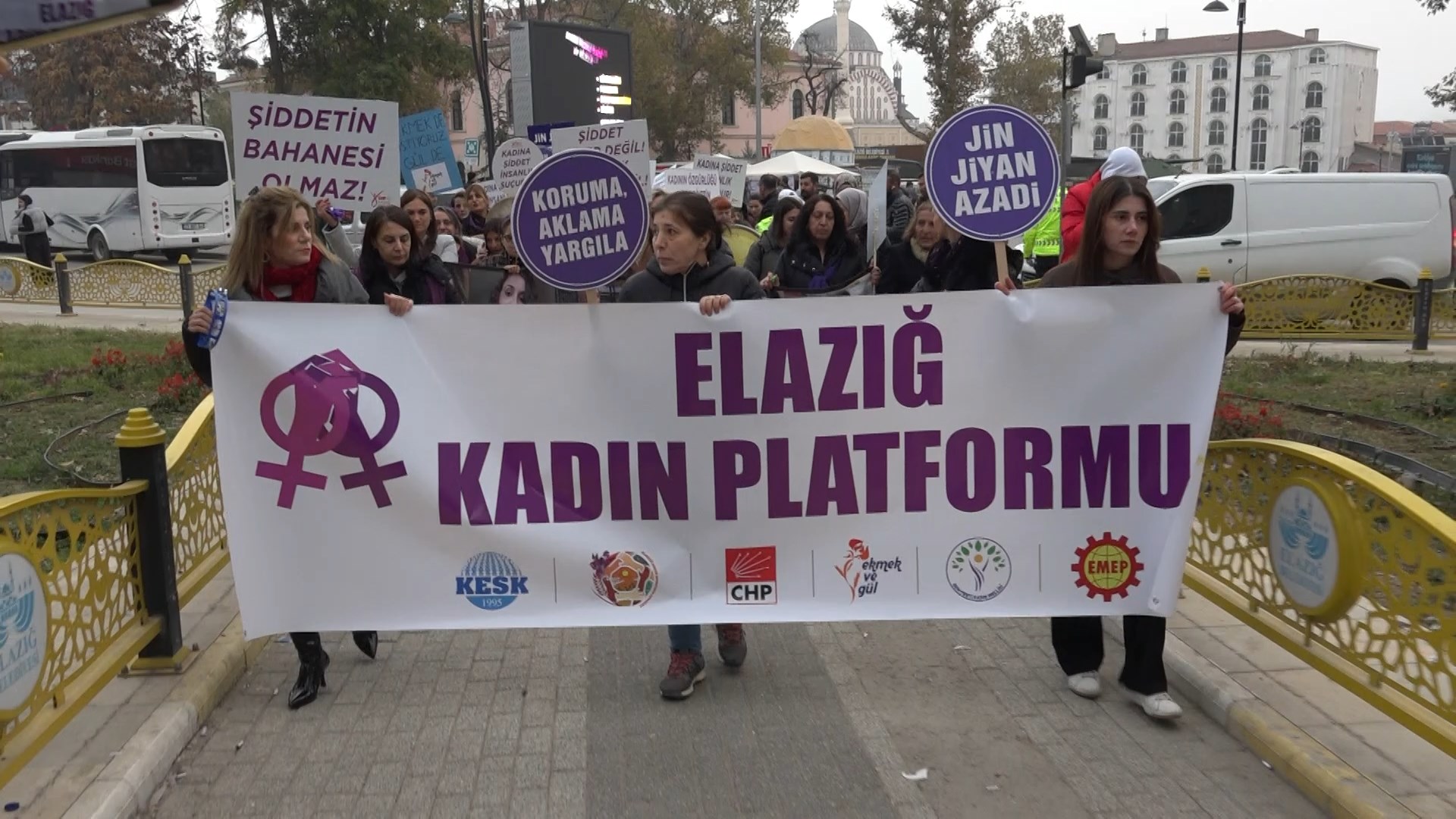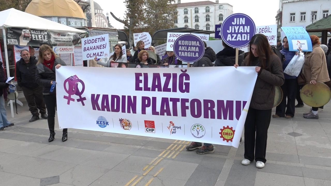 Elazığ Kadın Platformu, 25 Kasım Kadına Yönelik Şiddete Karşı Uluslararası Mücadele Günü kapsamında PTT Meydanı’nda bir araya geldi. Ellerinde döviz ve pankartlarla kadın cinayetlerine ve şiddete tepki gösteren platform üyelerine, sendikalar ve siyasi partiler de destek verdi. Kadınlar, açtıkları pankartlarda “Şiddetin bahanesi olmaz” ve “Kadına şiddet insanlık suçudur” ifadelerine yer verdi.