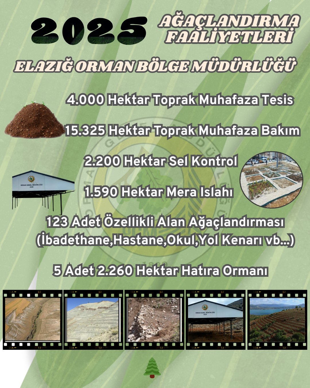 Elazığ Orman Bölge Müdürlüğü, 2025 yılı ağaçlandırma ve toprak muhafaza faaliyetlerine ilişkin hazırladığı geniş kapsamlı çalışma programını açıkladı. Açıklanan plan doğrultusunda, yalnızca fidan dikimiyle sınırlı kalmayan; toprak muhafazası, sel kontrolü, mera ıslahı ve özellikli alan ağaçlandırmalarını kapsayan çok yönlü uygulamalar hayata geçirilecek.