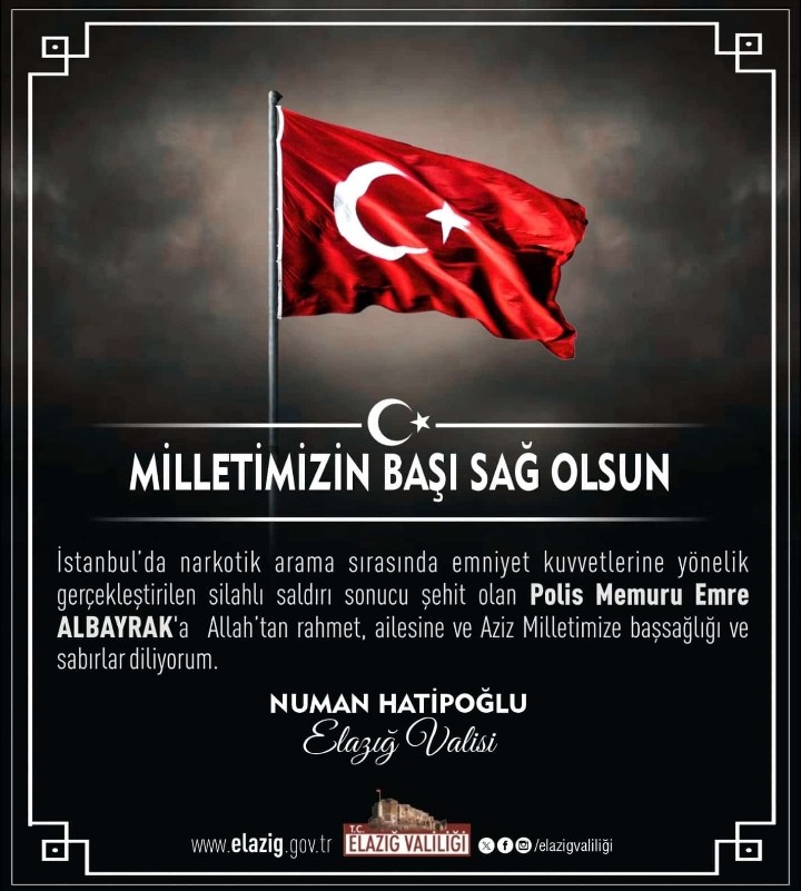Vali Hatipoğlu, yayımladığı mesajda şehit polis memuruna Allah’tan rahmet, ailesine ve tüm millete başsağlığı ile sabır dileklerini iletti. Açıklamada, güvenlik güçlerine yönelik saldırının derin üzüntü yarattığı vurgulandı.