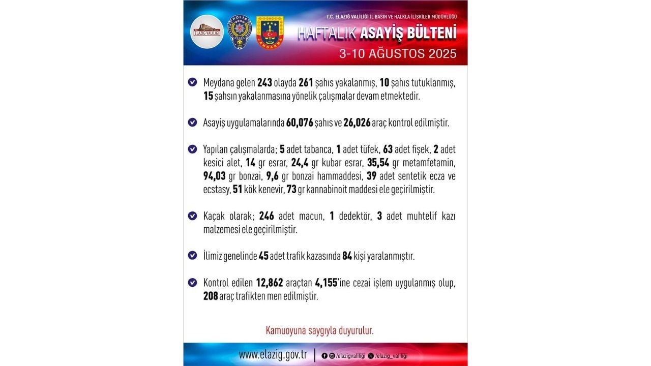 Elazığ’da 3-10 Ağustos 2025 tarihleri arasında yapılan asayiş uygulamalarında, toplam 243 olayda 261 şüpheli yakalandı. Bu kişilerden 10’u tutuklanırken, 15 kişinin yakalanmasına yönelik çalışmalar ise sürüyor.
