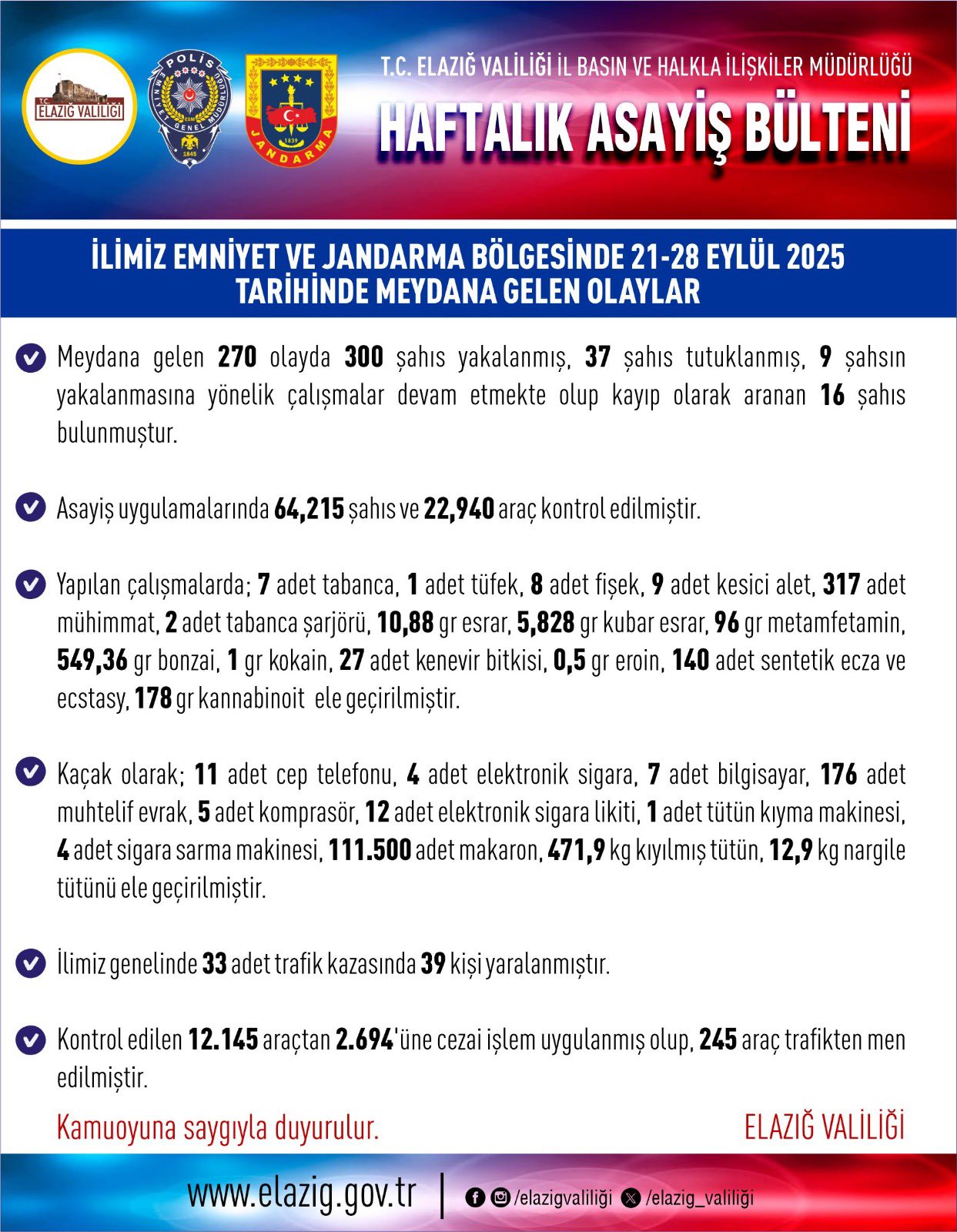 Elazığ’da Emniyet ve Jandarma birimleri, 21-28 Eylül tarihleri arasında kapsamlı operasyonlar ve denetimler gerçekleştirdi. Bir haftalık sürede toplam 270 olay kaydedilirken, bu olaylarla bağlantılı 300 kişi yakalandı. 37 kişi tutuklanırken, 9 kişinin yakalanması için çalışmalar devam ediyor. Ayrıca kayıp olarak aranan 16 kişi de bulundu.