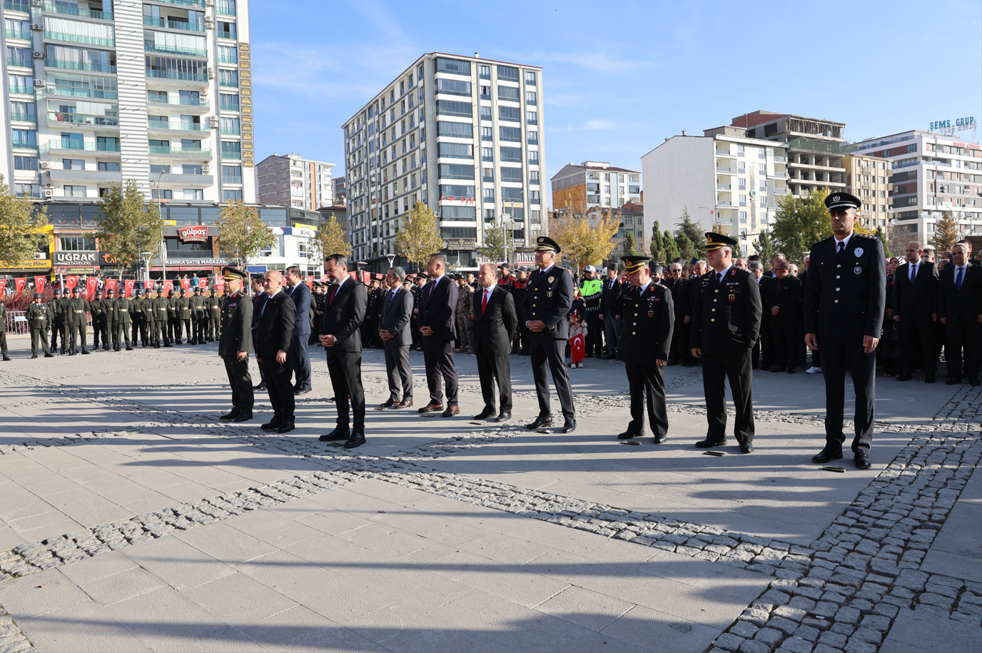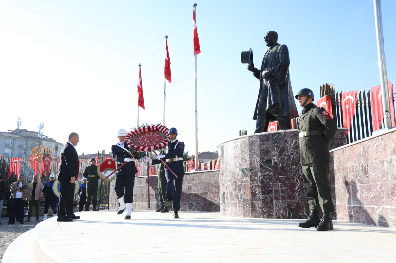 Elazığ Valiliği önündeki meydanda gerçekleştirilen törende, Atatürk Anıtı’na çelenk sunumu yapıldı. Çelenkleri sırasıyla Elazığ Valisi Numan Hatipoğlu, 8. Kolordu Komutanı Tuğgeneral Ümit Durmaz ve Elazığ Belediye Başkanı Şahin Şerifoğulları sundu.