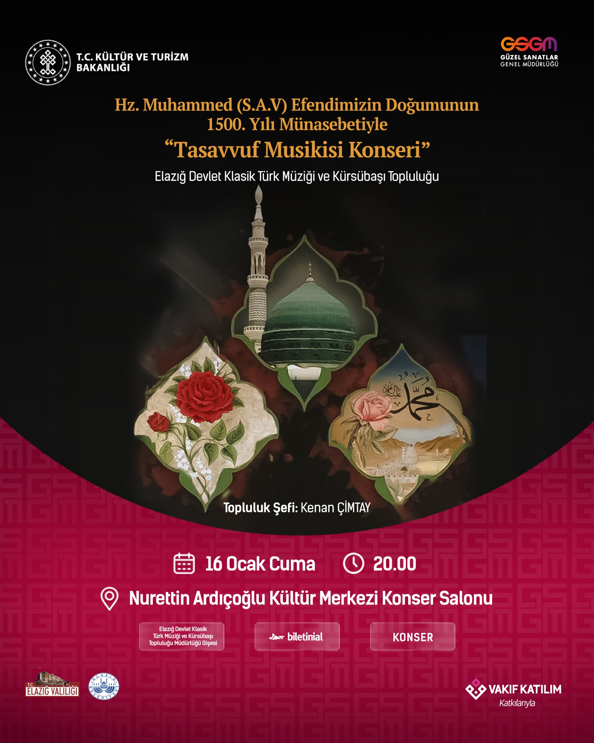 Elazığ Devlet Klasik Türk Müziği ve Kürsübaşı Topluluğu Müdürlüğü, kültürel ve manevi değeri yüksek bir etkinliğe daha imza atıyor. Hz. Muhammed’in (S.A.V.) doğumunun 1500. yıl dönümü vesilesiyle hazırlanan özel “Tasavvuf Musikisi Konseri”, 16 Ocak Cuma akşamı Elazığlı sanatseverlerle buluşacak.