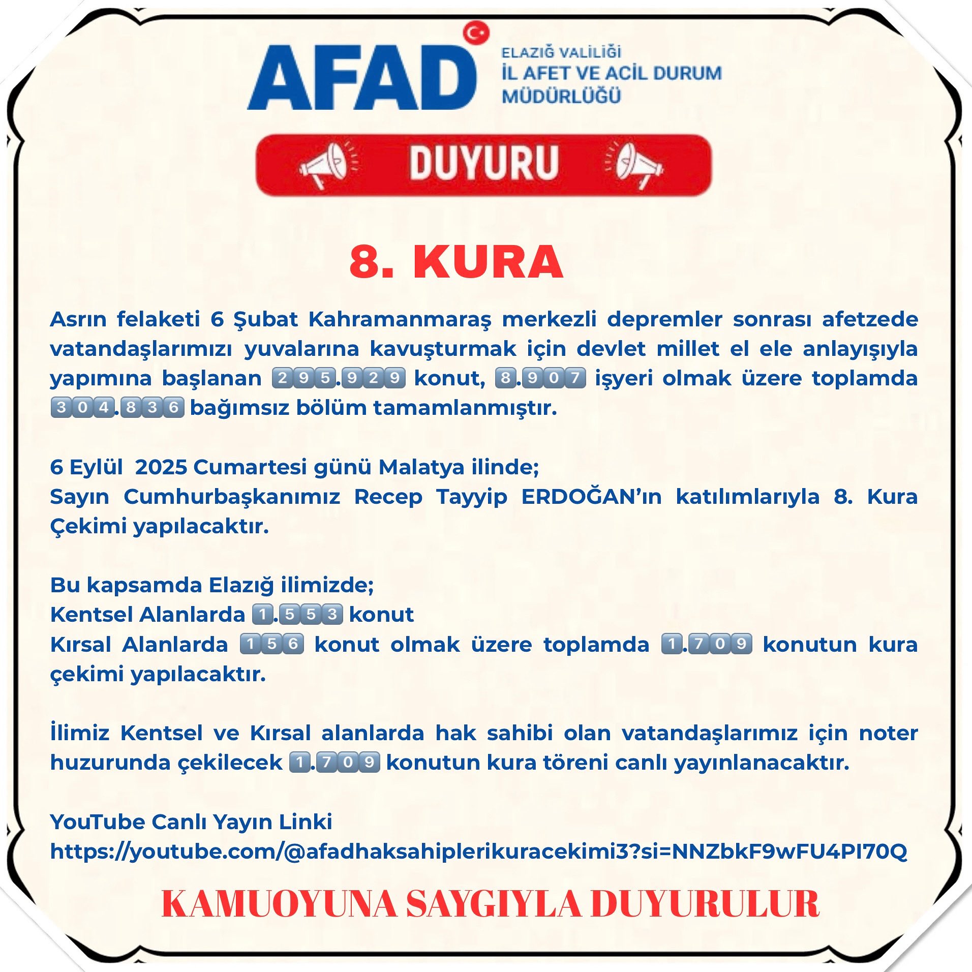 📺 Canlı yayın için bağlantı: AFAD Hak Sahipleri Kura Çekimi YouTube Kanalı