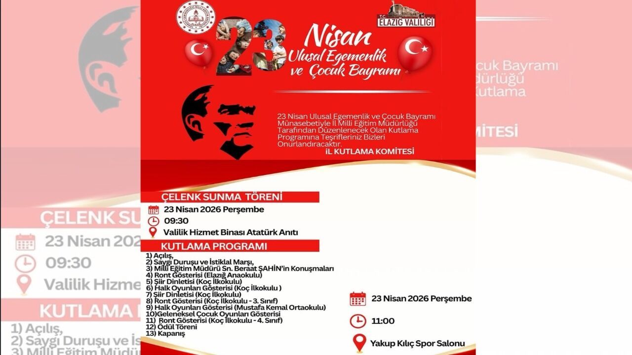 Elazığ’da 23 Nisan Ulusal Egemenlik ve Çocuk Bayramı dolayısıyla düzenlenecek kutlama programı, Elazığ Valiliği ile İl Milli Eğitim Müdürlüğü koordinasyonunda gerçekleştirilecek. Gün boyu devam edecek etkinliklerle bayramın anlam ve önemi geniş katılımla idrak edilecek.