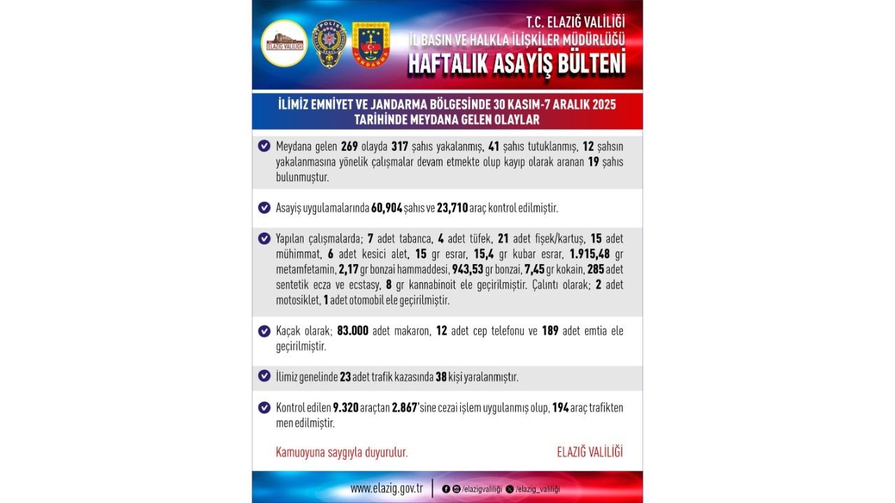 Asayiş birimlerince gerçekleştirilen denetimlerde 60 bin 904 kişi ile 23 bin 710 araç kontrol edildi. Uygulamalar sırasında suç unsuru taşıyan çok sayıda materyal ele geçirildi. Çalışmalarda; 7 tabanca, 4 av tüfeği, 21 fişek/kartuş, 15 adet mühimmat, 6 kesici alet ile çeşitli türlerde uyuşturucu maddeler bulundu. Uyuşturucu operasyonlarında 1 kilo 915 gram metamfetamin, 943,53 gram bonzai, 15 gram esrar, 15,4 gram kubar esrar, 7,45 gram kokain, 2,17 gram bonzai hammaddesi ve 285 adet sentetik ecza ele geçirildi. Ayrıca çalıntı olduğu tespit edilen 2 motosiklet ve 1 otomobil bulundu.