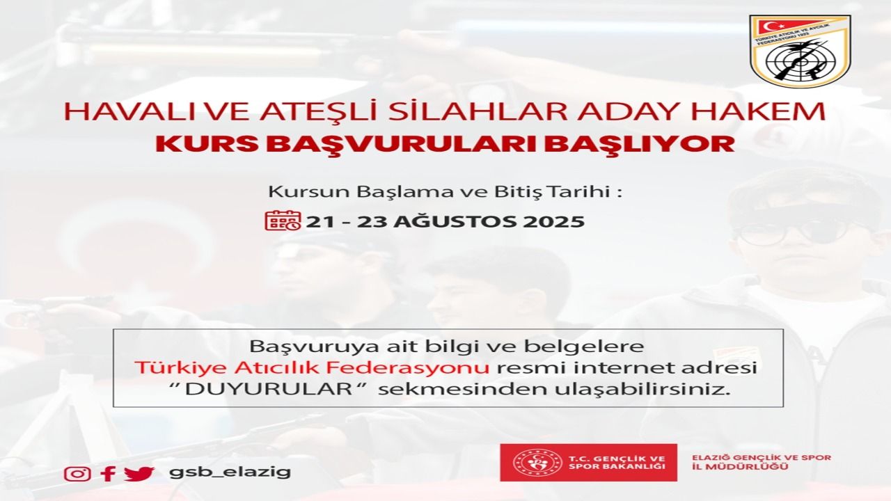 Elazığ Gençlik ve Spor İl Müdürlüğü koordinasyonunda, Türkiye Atıcılık ve Avcılık Federasyonu iş birliğiyle Havalı ve Ateşli Silahlar Aday Hakem Kursu 21-23 Ağustos 2025 tarihleri arasında Elazığ’da düzenlenecek. Atıcılık branşında hakemlik yapmak isteyen adaylara yönelik olarak açılacak bu kurs ile, hakem havuzunun genişletilmesi ve branşın ülke genelindeki organizasyon kalitesinin artırılması hedefleniyor. Kurs, hem teorik hem de uygulamalı eğitim içerikleriyle adaylara yetkinlik kazandırmayı amaçlıyor.