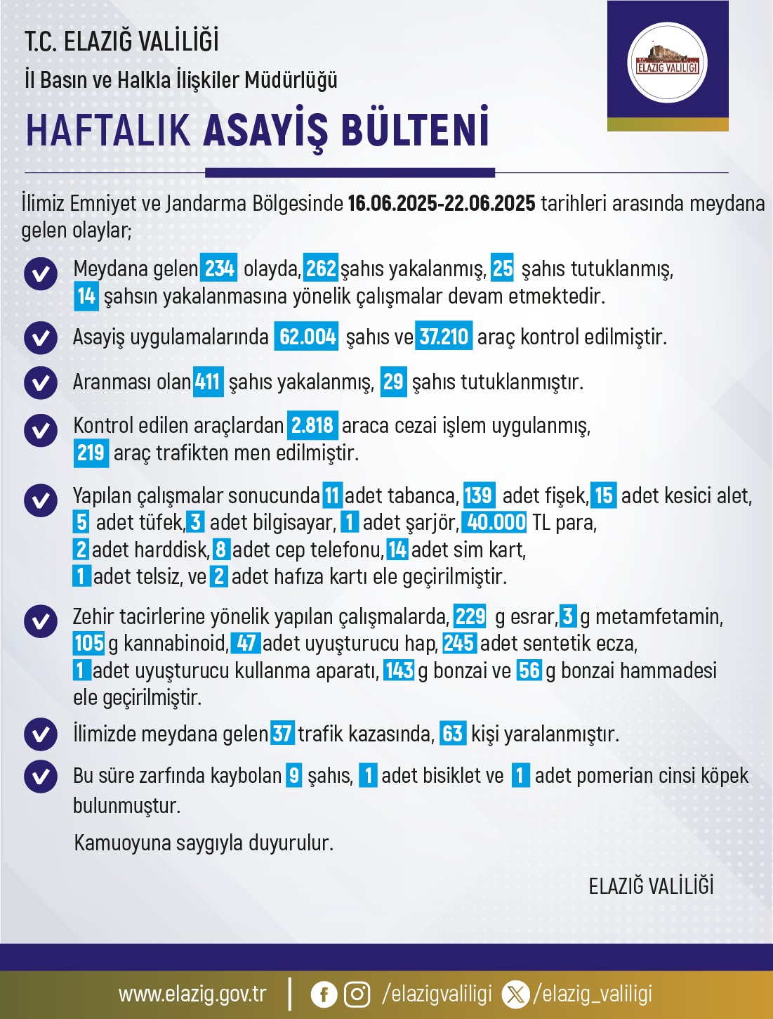 Elazığ İl Emniyet Müdürlüğü ve İl Jandarma Komutanlığı ekiplerince 16-22 Haziran 2025 tarihleri arasında yürütülen asayiş ve güvenlik uygulamalarında önemli sonuçlar elde edildi.