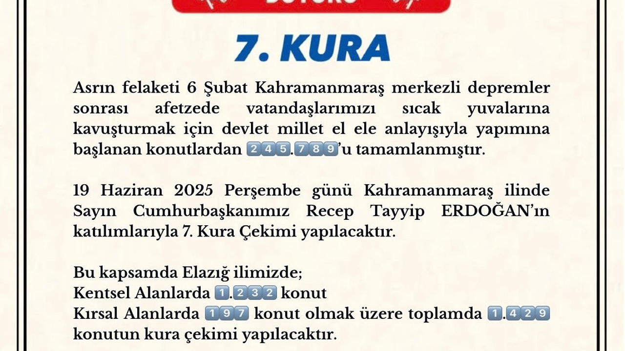 6 Şubat 2023 tarihinde meydana gelen Kahramanmaraş merkezli depremlerin ardından Elazığ’da inşa edilen kalıcı konutların hak sahipleri belirleniyor. Yapımı tamamlanan toplam 1.429 konut için kura çekimi, 19 Haziran 2025 Perşembe günü gerçekleştirilecek.