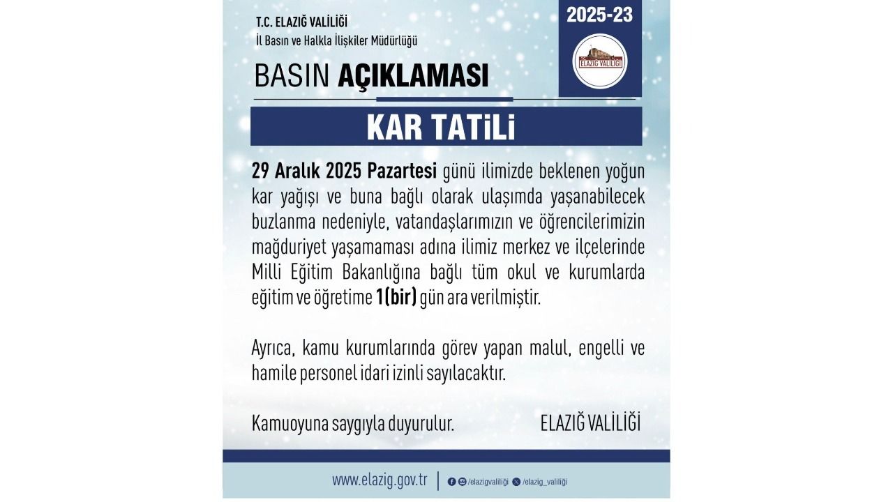 Elazığ Valiliği'nden yapılan açıklamada, '29 Aralık 2025 Pazartesi günü ilimizde beklenen yoğun kar yağışı ve buna bağlı olarak ulaşımda yaşanabilecek buzlanma nedeniyle, vatandaşlarımızın ve öğrencilerimizin mağduriyet yaşamaması adına ilimiz merkez ve ilçelerinde Milli Eğitim Bakanlığına bağlı tüm okul ve kurumlarda eğitim ve öğretime 1 gün ara verilmiştir. Ayrıca, kamu kurumlarında görev yapan malul, engelli ve hamile personel idari izinli sayılacaktır' denildi.