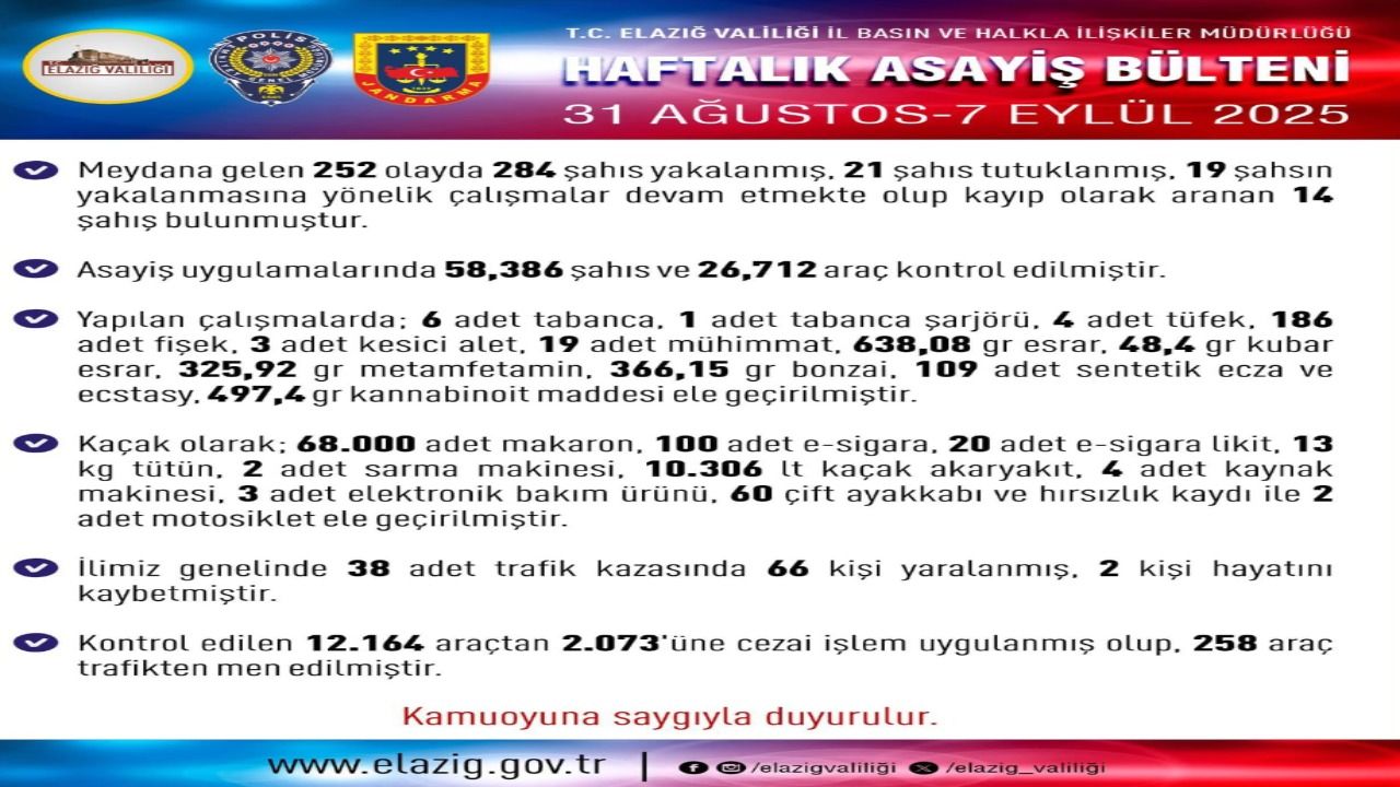 Trafik denetimleri kapsamında ise 38 kazada 66 kişi yaralanırken, 2 kişi hayatını kaybetti. Kontrol edilen 12.164 araçtan 2.073’üne cezai işlem uygulanırken, 258 araç trafikten men edildi.