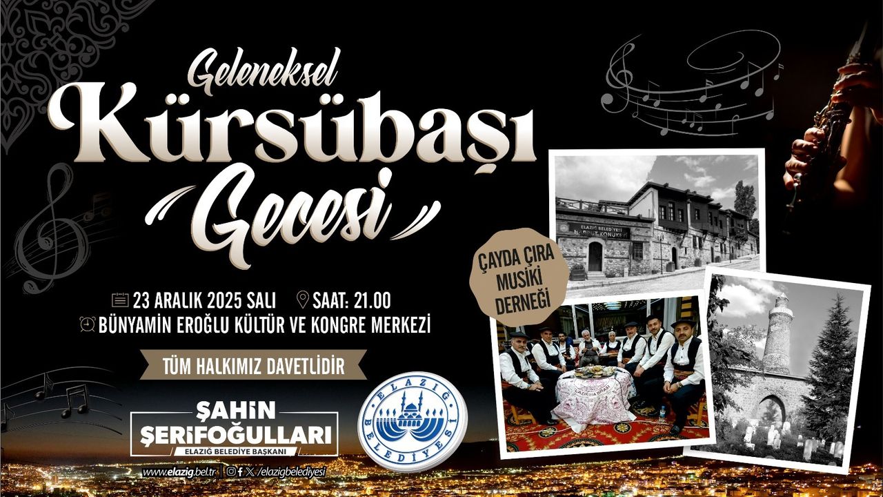 Elazığ Belediyesi Kültür, Sanat ve Sosyal İşler Müdürlüğü, Kürsübaşı geleneğini ve halk oyunlarını yeni nesillere aktarmak, aynı zamanda vatandaşların sosyal hayatına katkı sunmak amacıyla çalışmalarını sürdürüyor. Bu kapsamda Elazığ’da faaliyet gösteren musiki dernekleri tarafından her ayın 23’ünde Kürsübaşı Gecesi programı düzenleyecek. 23 Aralık Salı günü saat 21.00’de Bünyamin Eroğlu Kültür ve Kongre Merkezi’nde düzenlenecek program, Çaydaçıra Musiki Derneği’nin Kürsübaşı etkinliği ile gerçekleştirilecek. Harput musikisinin en güzel örnekleri ile halk oyunları gösterilerinin yer alacağı program, Kanal Fırat televizyonundan canlı olarak yayınlanacak. Elazığ Belediyesi Basın-Yayın ve Halkla İlişkiler Müdürlüğü’nden yapılan açıklamada, medeniyetler merkezi Harput’un eşsiz musikisi ile müzik ziyafetinin sunulacağı programa tüm vatandaşlar davet edildi.