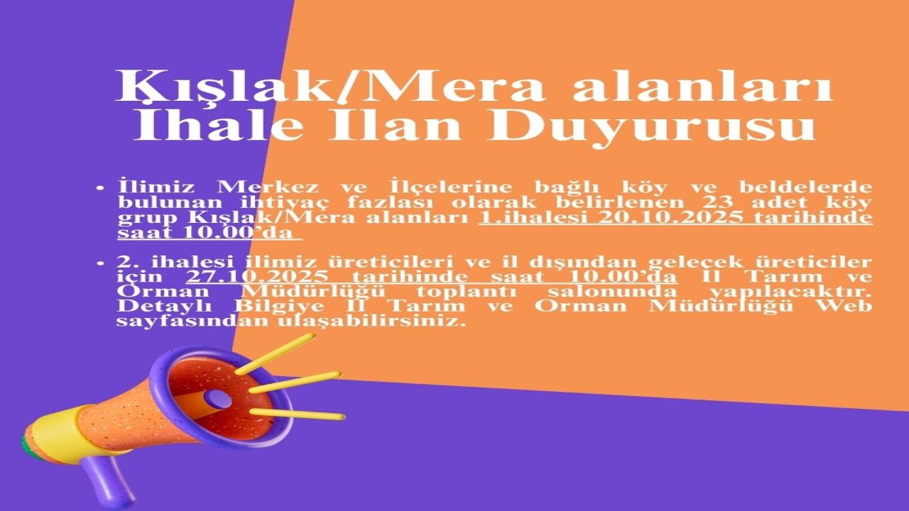 İlk ihale 20 Ekim 2025 Pazartesi günü saat 10.00’da gerçekleştirilecek. Bu ihalede Elazığ Merkez ve ilçelerde yer alan çeşitli kışlak ve mera alanları üreticilere kiralık olarak sunulacak.
