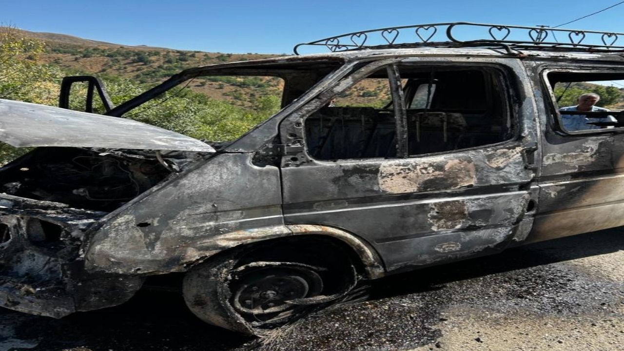 Elazığ’da alevlere teslim olan minibüs, yanarak kullanılamaz hale geldi.